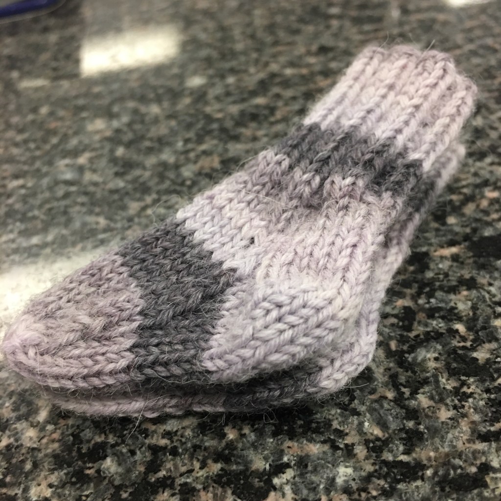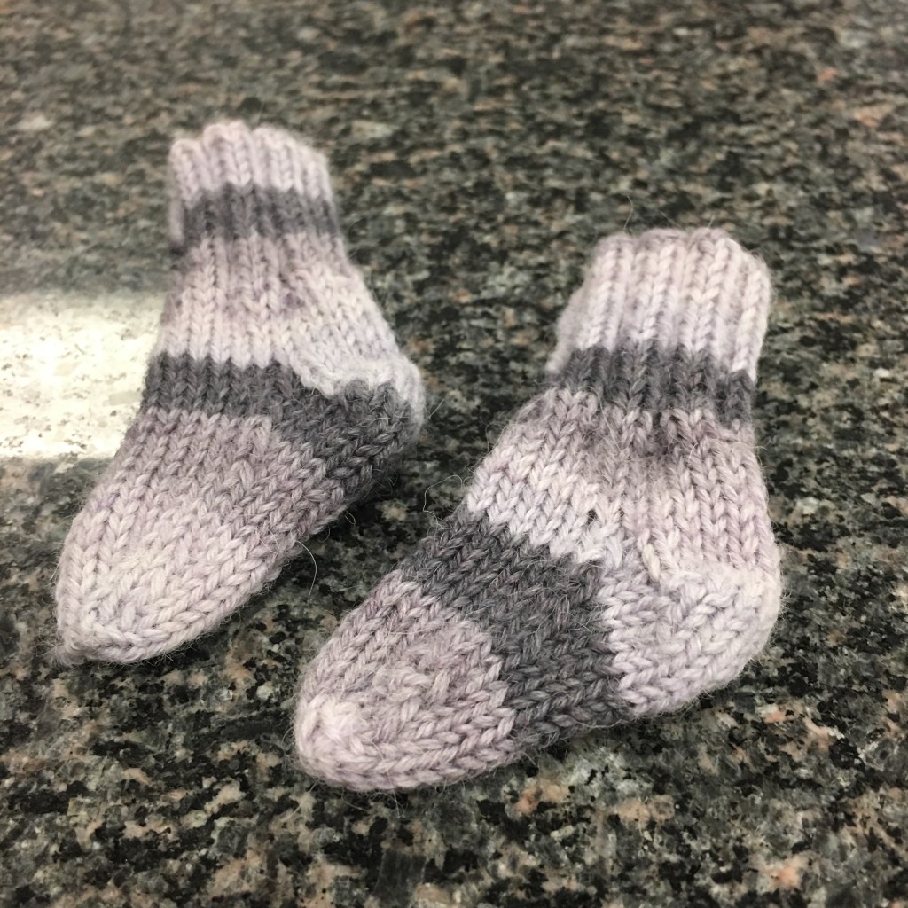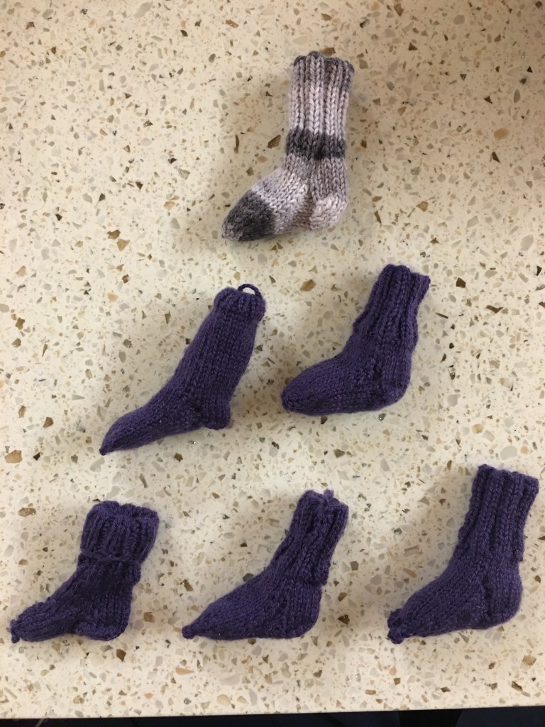 After much trial and error, I finally managed the perfect pair of socks for a micro-preemie! The first pair was this gorgeous grey/lilac yarn leftover from a different project, but the next ones were purple, and then red, and then blue.
